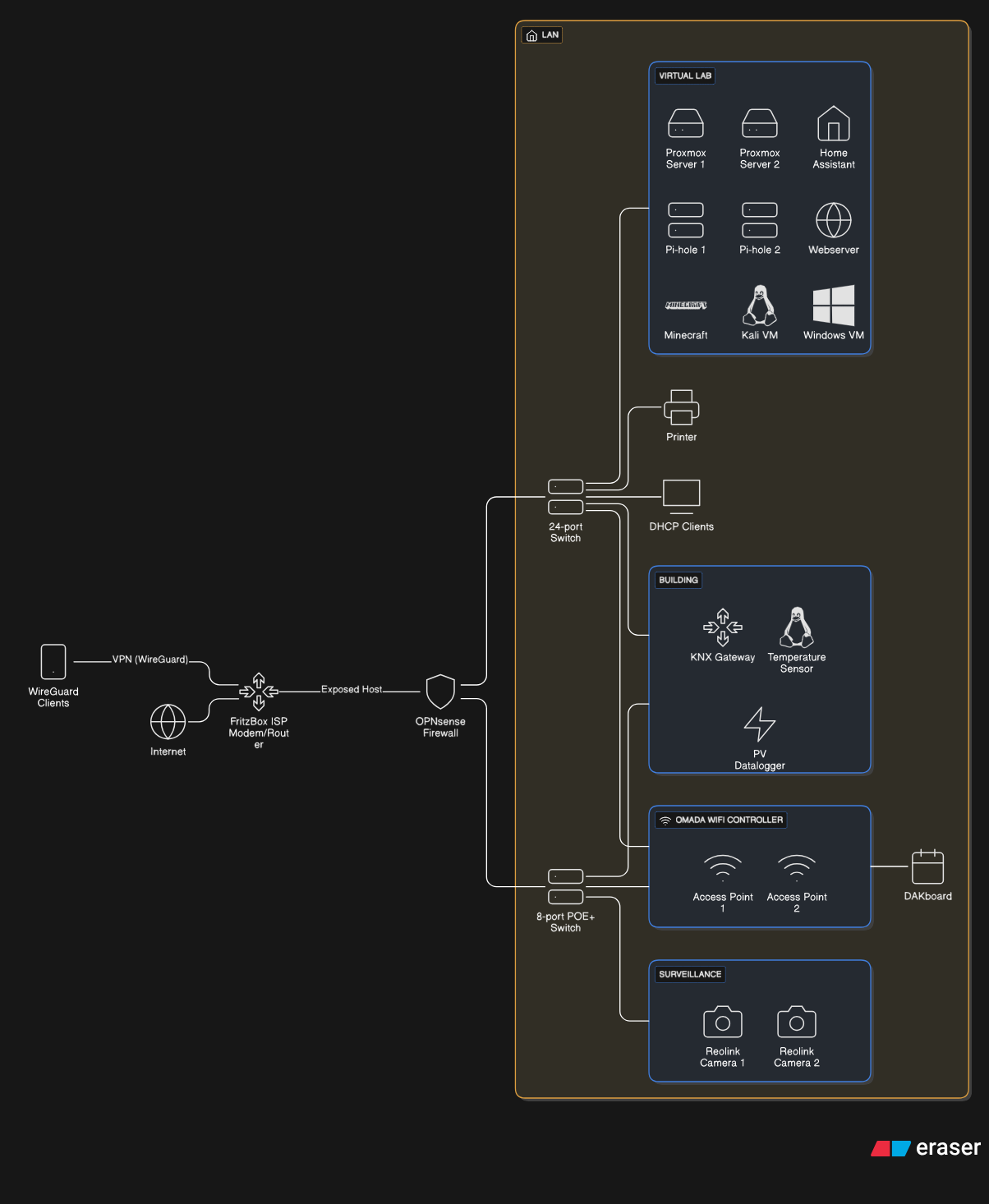 To migrate I first needed to understand how I am using my network as of now, to find a good replacement for my setup. And be asured, I thought about just ditching the firewall and use the FritzBox as is. But there would be challanges I was not ready to take on. Let me explain how my network looked like before the migration.